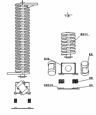 螺旋垂直提升機的驅動裝置振動電機安裝在輸送塔下部,兩臺振動電機對稱交叉安裝,輸送塔由管體和焊接在管體周圍的螺旋輸送槽組成,輸送塔座于減振裝置上,減振裝置由底座和隔振彈簧組成。當垂直提升機工作時,根據雙振動電機自同步原理,由振動電機產生激振力,強迫整個輸送塔體作水平圓運動和向上垂直運動的空間復合振動,螺旋槽內的物料則受輸送槽的作用,作勻速拋擲圓運動,沿輸送槽體向上運動,從而完成物料的向上(或向下)輸送作業,因此本設備也被成為振動垂直輸送機。