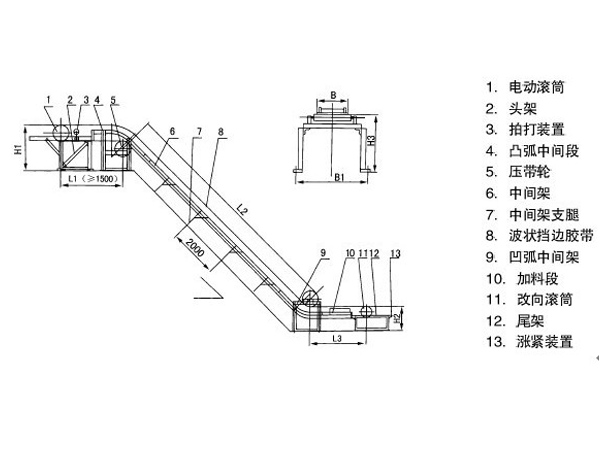 大傾角帶式輸送機輸送傾角,采用滾筒電機集中驅(qū)動,由:電動滾筒、頭架、拍打裝置、凸弧中間段、壓帶輪、中間架、中間架支腿、波狀擋邊膠帶、凹弧中間架、加料段、改向滾筒、尾架、漲緊裝置。其結(jié)構(gòu)見圖下圖